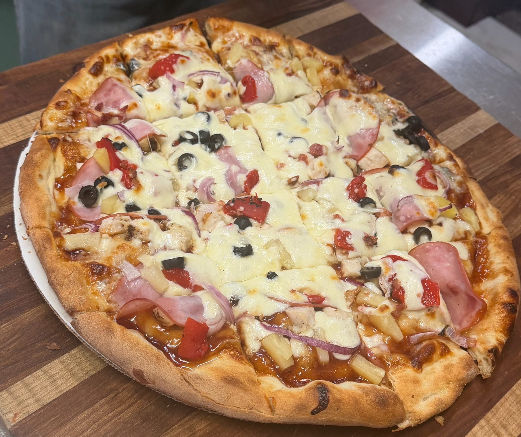 BBQ Base, grilled chicken, pineapple, ham, BACON, BLACK OLIVES, ROASTED RED PEPPERS, RED ONIONS, MOZZERELLA CHEESE.